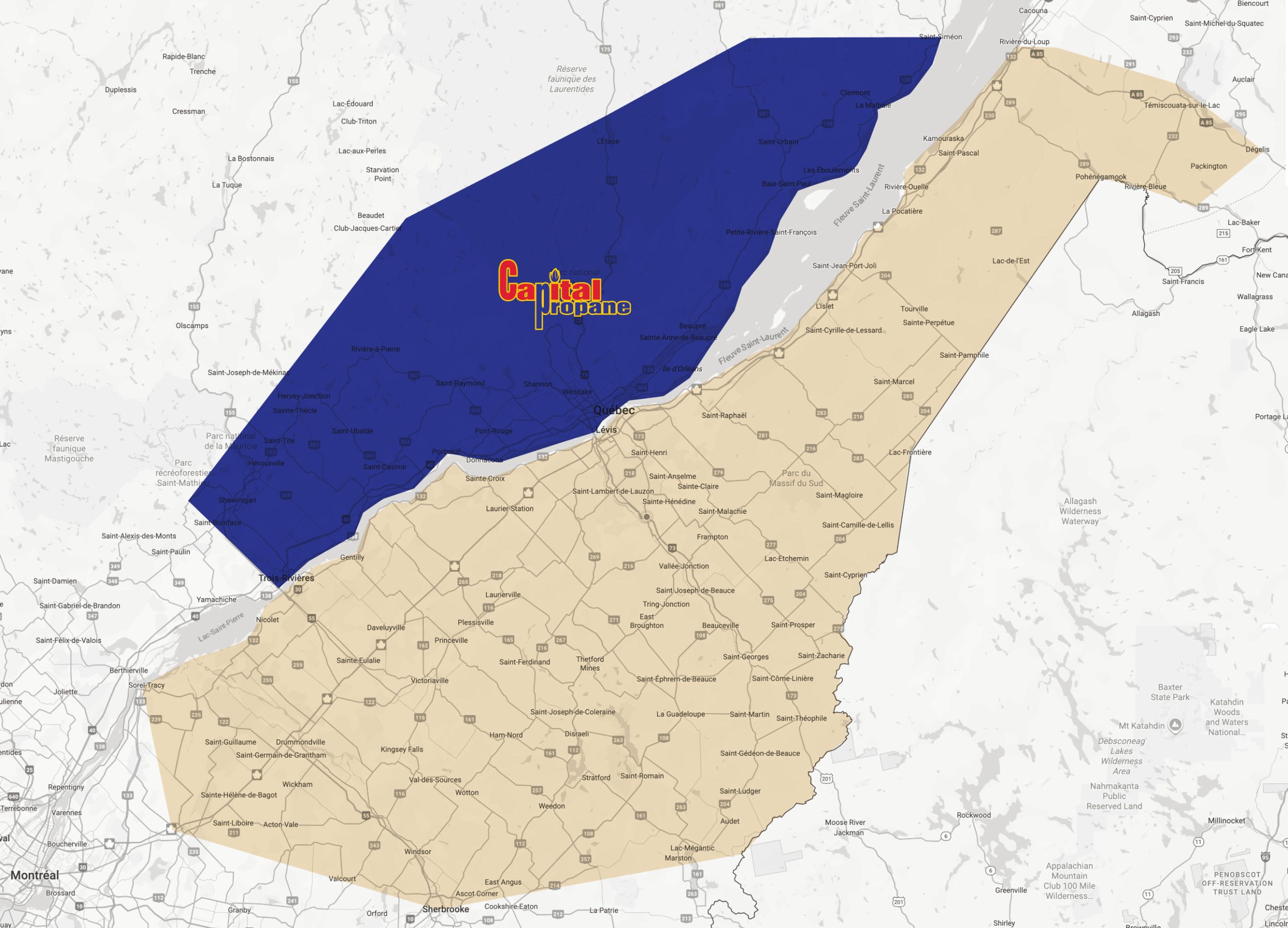 Veuillez noter que la zone colorée ne représente qu’une approximation du territoire couvert par Capital Propane. Pour vérifier si votre secteur est couvert, veuillez contacter un de nos représentants.